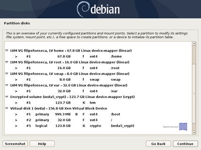 This tutorial will guide you on installing latest release of Debian 10 (codename Buster) with swap, /home, /root and /var LVM partitions encrypted on top of a LUKS encrypted physical volume.